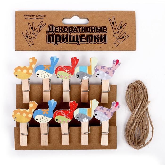 - Прищепки декоративные "Весенние птички" с верёвкой для подвеса 10шт/набор 3949369